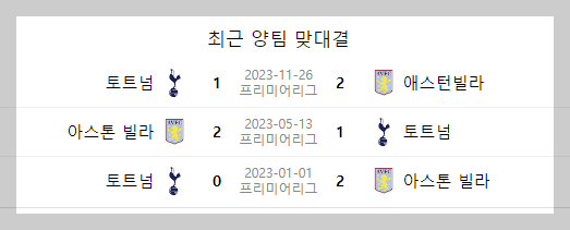 아스톤빌라가 내리 3경기 동안 토트넘에 승리하며 우위를 점하고 있습니다.
